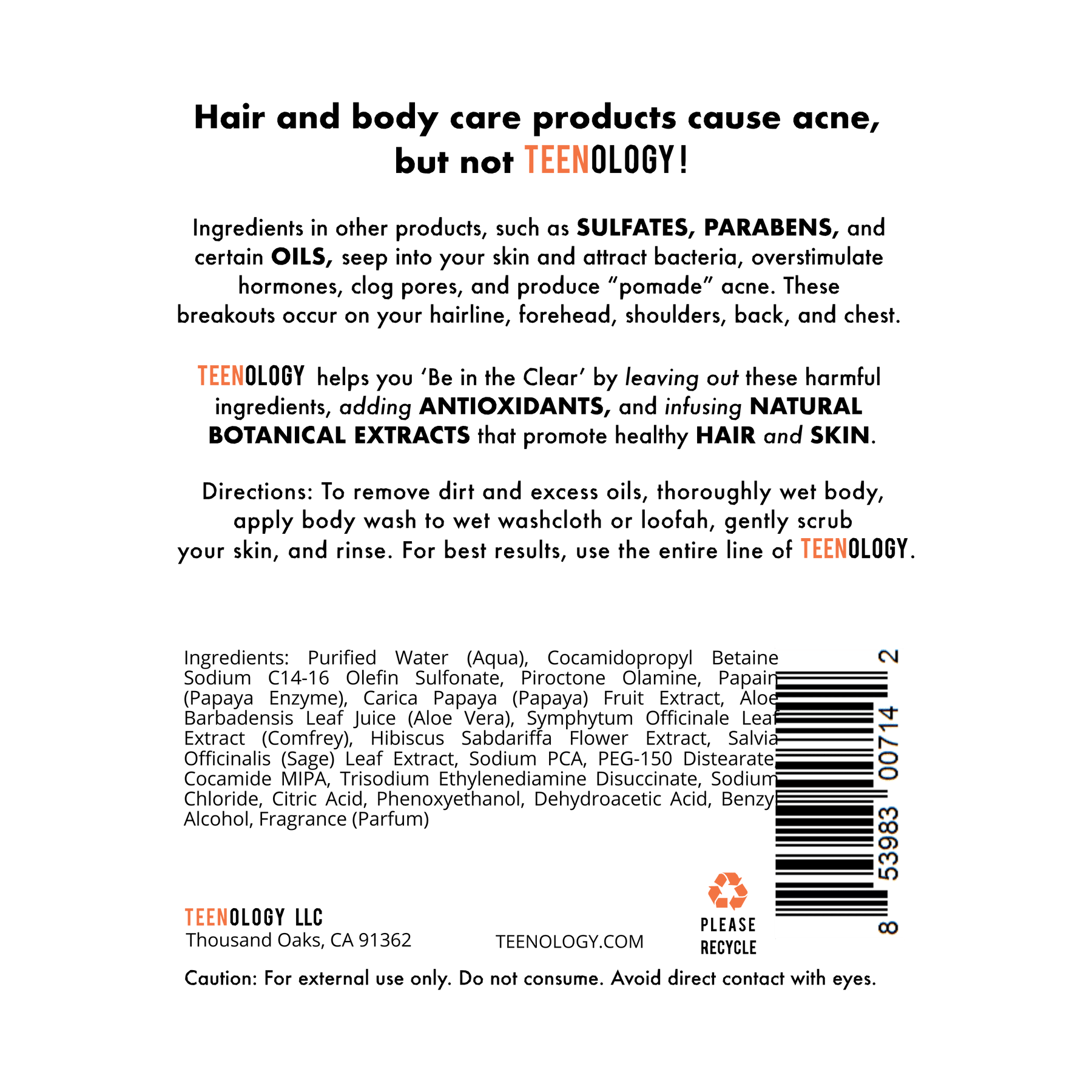 Say goodbye to acne-causing hair and body care products and hello to vibrant hair and clear skin with TEENOLOGY! Our premium products gently cleanse, nourish, and revitalize -- all without the use of sulfates, parabens, or pore-clogging oils. These common ingredients found in many other products seep into your skin, attract bacteria, block pores, and cause “pomade” acne breakouts on your forehead, shoulders, back, and chest.